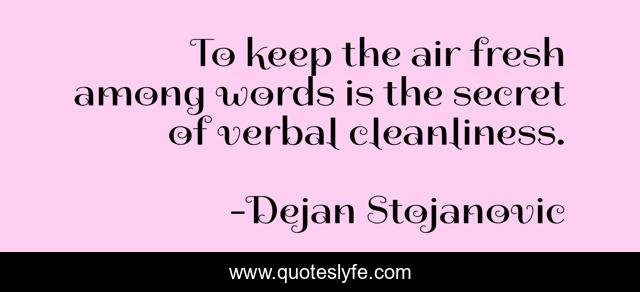 This page presents the quote "To keep the air fresh among words is the secret of verbal cleanliness.". Author of this quote is Dejan Stojanovic. This quote is about literature, verbal, cleanliness, dejan-stojanovic, poetry, air, quotes, secret, fresh-air,.