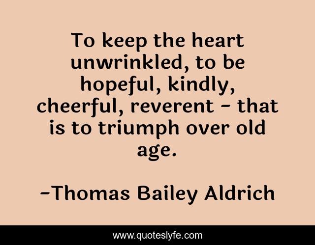 This page presents the quote "To keep the heart unwrinkled, to be hopeful, kindly, cheerful, reverent - that is to triumph over old age.". Author of this quote is Thomas Bailey Aldrich. This quote is about heart, old age, triumph,.