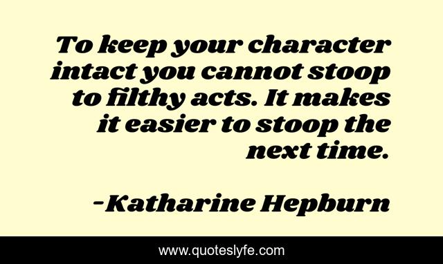 This page presents the quote "To keep your character intact you cannot stoop to filthy acts. It makes it easier to stoop the next time.". Author of this quote is Katharine Hepburn. .