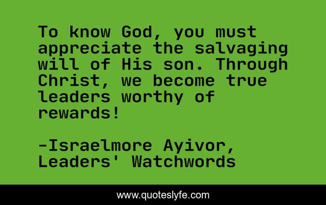 This page presents the quote "To know God, you must appreciate the salvaging will of His son. Through Christ, we become true leaders worthy of rewards!". Author of this quote is Israelmore Ayivor, Leaders' Watchwords. This quote is about jesus-christ, food-for-thought, rewards, christ, god, appreciate, jehovah, jesus, appreciation,.