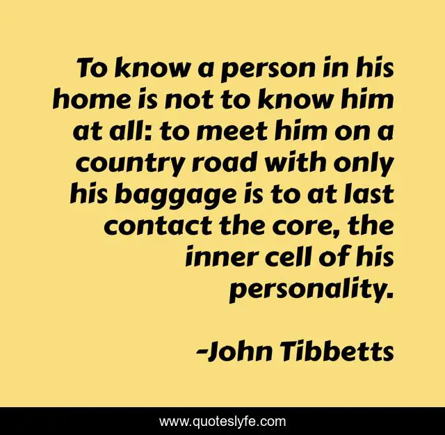 This page presents the quote "To know a person in his home is not to know him at all: to meet him on a country road with only his baggage is to at last contact the core, the inner cell of his personality.". Author of this quote is John Tibbetts. This quote is about travel, friendship,.