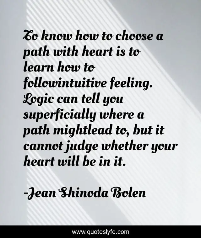 This page presents the quote "To know how to choose a path with heart is to learn how to followintuitive feeling. Logic can tell you superficially where a path mightlead to, but it cannot judge whether your heart will be in it.". Author of this quote is Jean Shinoda Bolen. This quote is about heart, intuition, follow-your-heart, psychic, intuitive,.