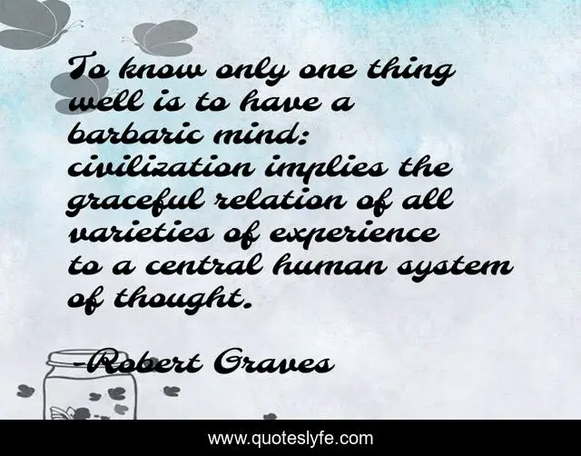 This page presents the quote "To know only one thing well is to have a barbaric mind: civilization implies the graceful relation of all varieties of experience to a central human system of thought.". Author of this quote is Robert Graves. This quote is about barbarism, civilization,.