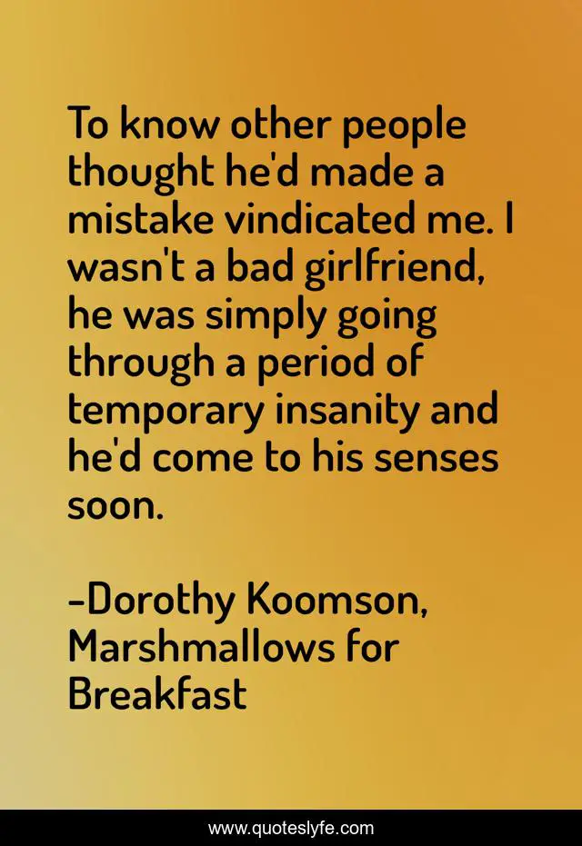 This page presents the quote "To know other people thought he'd made a mistake vindicated me. I wasn't a bad girlfriend, he was simply going through a period of temporary insanity and he'd come to his senses soon.". Author of this quote is Dorothy Koomson, Marshmallows for Breakfast. .