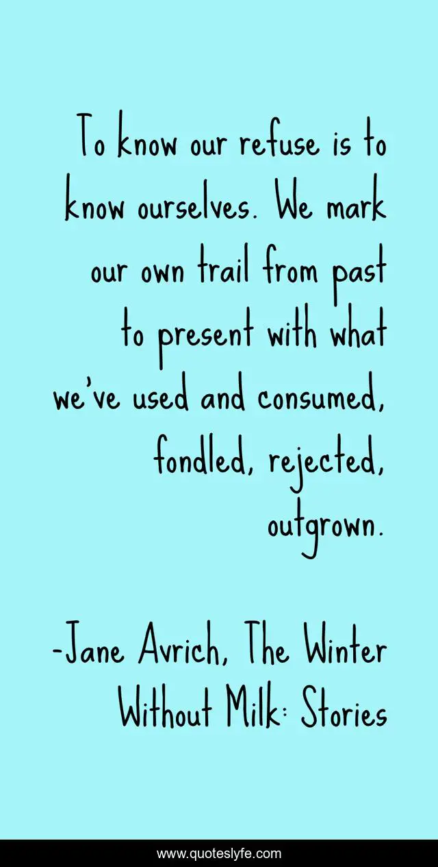 "Jane Avrich, The Winter Without Milk: Stories Quotes." Quoteslyfe.com, 2025. Fri. 05 Dec. 2025. <https://www.quoteslyfe.com/quote/To-know-our-refuse-is-to-know-143435>.