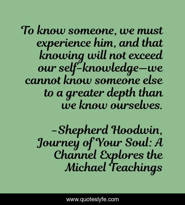 This page presents the quote "To know someone, we must experience him, and that knowing will not exceed our self-knowledge—we cannot know someone else to a greater depth than we know ourselves.". Author of this quote is Shepherd Hoodwin, Journey of Your Soul: A Channel Explores the Michael Teachings. This quote is about self-knowledge, journey, knowledge-of-people, soul,.