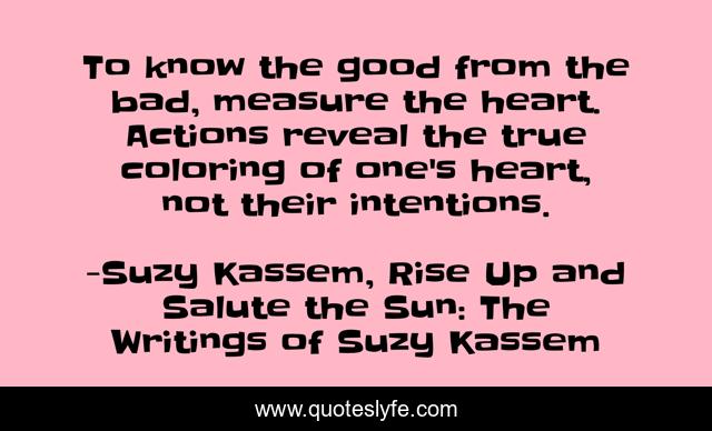 This page presents the quote "To know the good from the bad, measure the heart. Actions reveal the true coloring of one's heart, not their intentions.". Author of this quote is Suzy Kassem, Rise Up and Salute the Sun: The Writings of Suzy Kassem. This quote is about life, good, people, character, deeds, evil, intentions, bad, actions,.