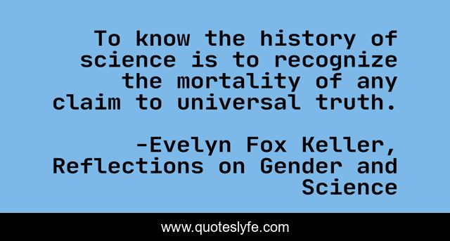 This page presents the quote "To know the history of science is to recognize the mortality of any claim to universal truth.". Author of this quote is Evelyn Fox Keller, Reflections on Gender and Science. This quote is about science, truth,.