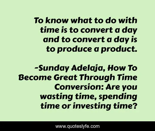 This page presents the quote "To know what to do with time is to convert a day and to convert a day is to produce a product.". Author of this quote is Sunday Adelaja, How To Become Great Through Time Conversion: Are you wasting time, spending time or investing time?. This quote is about convert, time-conversion, productivity, wealth, gift, greatness, life, great, value,.