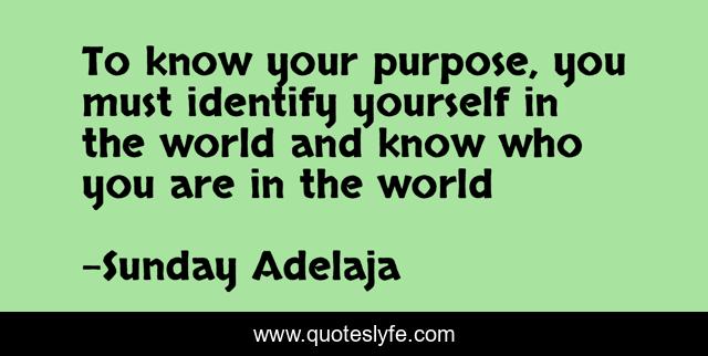 This page presents the quote "To know your purpose, you must identify yourself in the world and know who you are in the world". Author of this quote is Sunday Adelaja. This quote is about life, people, self-discovery, purpose, world, identity,.