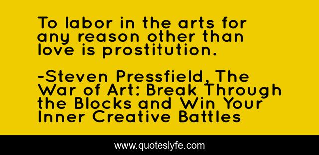 This page presents the quote "To labor in the arts for any reason other than love is prostitution.". Author of this quote is Steven Pressfield, The War of Art: Break Through the Blocks and Win Your Inner Creative Battles. This quote is about creative-thinking, sociology, creativity, inspiration, writing,.
