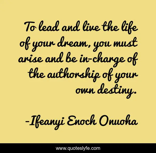 This page presents the quote "To lead and live the life of your dream, you must arise and be in-charge of the authorship of your own destiny.". Author of this quote is Ifeanyi Enoch Onuoha. This quote is about authorship, life, destiny, author,.