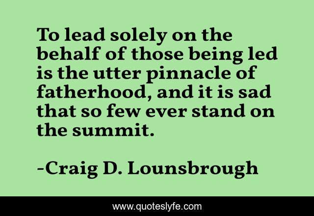 This page presents the quote "To lead solely on the behalf of those being led is the utter pinnacle of fatherhood, and it is sad that so few ever stand on the summit.". Author of this quote is Craig D. Lounsbrough. This quote is about dad, sacrificial, pinnacle, parent, lead, sacrifice, father, selflessness, parenting,.