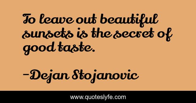 This page presents the quote "To leave out beautiful sunsets is the secret of good taste.". Author of this quote is Dejan Stojanovic. This quote is about beautiful, sunsets, literature, taste, dejan-stojanovic, poetry, wisdom, quotes, secret,.