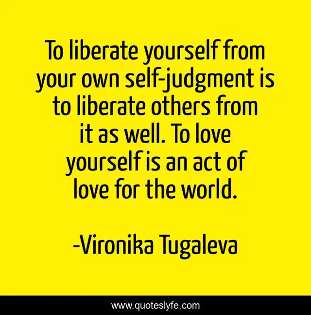 This page presents the quote "To liberate yourself from your own self-judgment is to liberate others from it as well. To love yourself is an act of love for the world.". Author of this quote is Vironika Tugaleva. This quote is about self-love, love, love-yourself, liberation, leadership, healing, self-judgment, affection,.