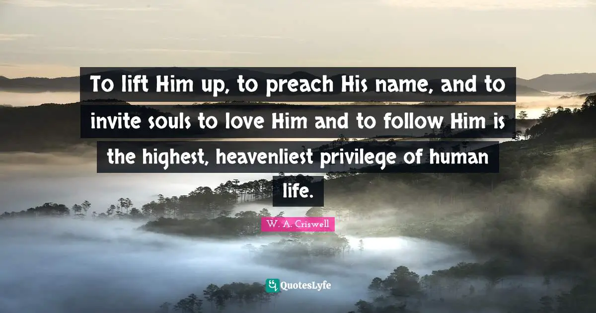 This page presents the quote "To lift Him up, to preach His name, and to invite souls to love Him and to follow Him is the highest, heavenliest privilege of human life.". Author of this quote is W. A. Criswell. This quote is about human life, life, affection, god, highest, love, privilege,.