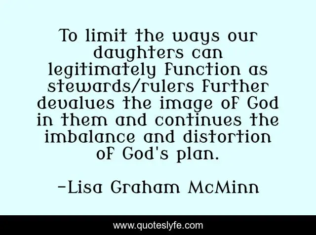 This page presents the quote "To limit the ways our daughters can legitimately function as stewards/rulers further devalues the image of God in them and continues the imbalance and distortion of God's plan.". Author of this quote is Lisa Graham McMinn. This quote is about daughter, feminist, egalitarian, gender, theology, women,.