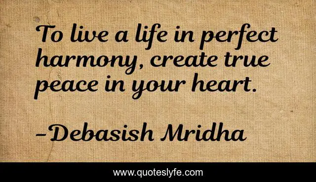 This page presents the quote "To live a life in perfect harmony, create true peace in your heart.". Author of this quote is Debasish Mridha. This quote is about peace, true-peace, philosophy, debasish-mridha, live-in-harmony, quotes, inspirational, enthusiasm, debasish-mridha-m-d,.