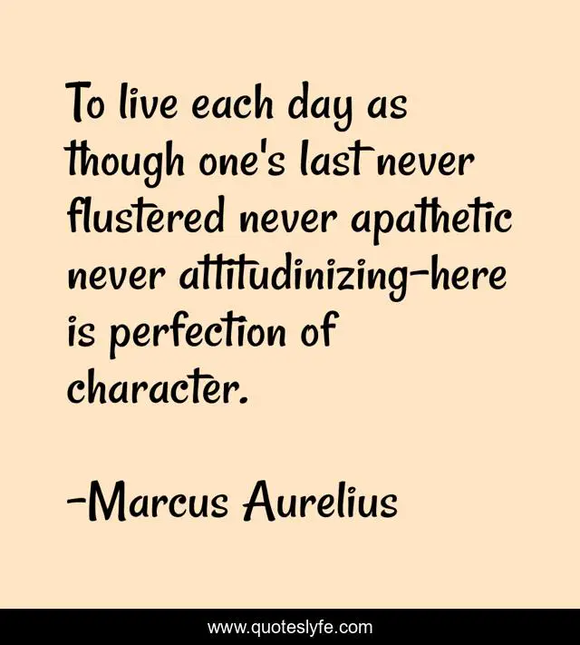 This page presents the quote "To live each day as though one's last never flustered never apathetic never attitudinizing-here is perfection of character.". Author of this quote is Marcus Aurelius. This quote is about day, one,.