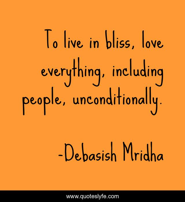 This page presents the quote "To live in bliss, love everything, including people, unconditionally.". Author of this quote is Debasish Mridha. This quote is about love-uncondtionally, love, philosophy, debasish-mridha, quotes, bliss, debasish-mridha-md, inspirational, enthusiasm,.