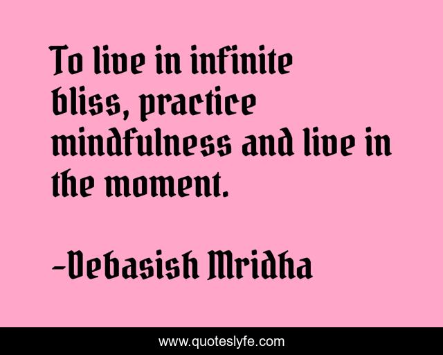 This page presents the quote "To live in infinite bliss, practice mindfulness and live in the moment.". Author of this quote is Debasish Mridha. This quote is about mindfulness, practice-mindfulness, philosophy, debasish-mridha, quotes, infinite-bliss, debasish-mridha-md, inspirational, enthusiasm,.