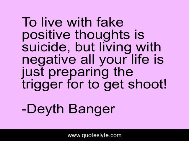 This page presents the quote "To live with fake positive thoughts is suicide, but living with negative all your life is just preparing the trigger for to get shoot!". Author of this quote is Deyth Banger. This quote is about shoot, confidence, positive, negative, live, fake, thoughts,.
