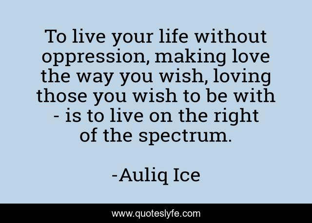 This page presents the quote "To live your life without oppression, making love the way you wish, loving those you wish to be with - is to live on the right of the spectrum.". Author of this quote is Auliq Ice. This quote is about freedom, freedom-of-expression, love, liberty, affection,.
