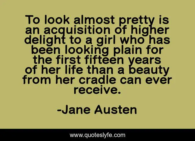 This page presents the quote "To look almost pretty is an acquisition of higher delight to a girl who has been looking plain for the first fifteen years of her life than a beauty from her cradle can ever receive.". Author of this quote is Jane Austen. This quote is about looking, life, girl,.