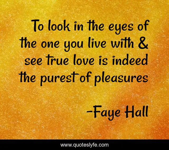 This page presents the quote "To look in the eyes of the one you live with & see true love is indeed the purest of pleasures". Author of this quote is Faye Hall. This quote is about true-love, eyes, love, pleasures, eyes-the-true-expression, purest, affection,.