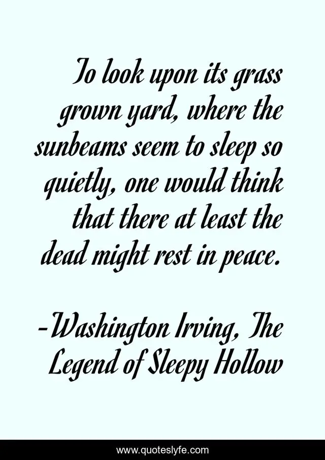 This page presents the quote "To look upon its grass grown yard, where the sunbeams seem to sleep so quietly, one would think that there at least the dead might rest in peace.". Author of this quote is Washington Irving, The Legend of Sleepy Hollow. This quote is about death, peace,.