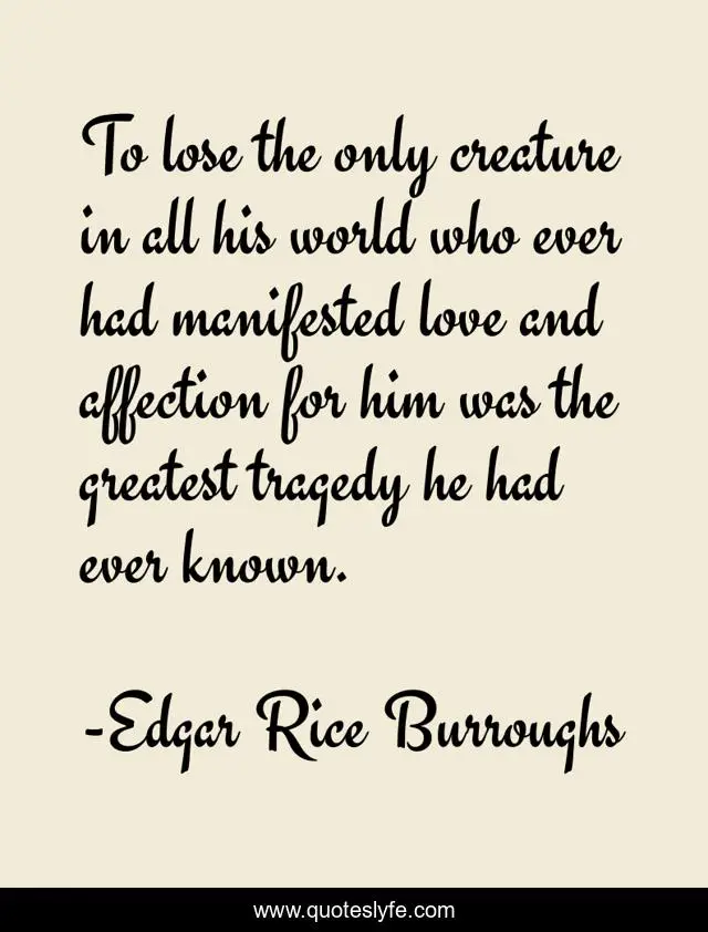 This page presents the quote "To lose the only creature in all his world who ever had manifested love and affection for him was the greatest tragedy he had ever known.". Author of this quote is Edgar Rice Burroughs. This quote is about loss, death, love, kala-s-death, tragedy, affection,.