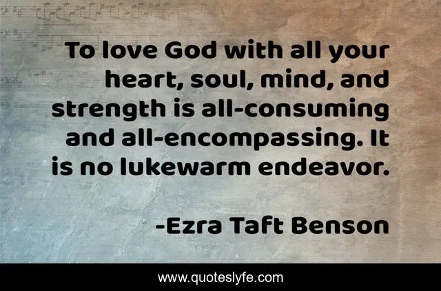 This page presents the quote "To love God with all your heart, soul, mind, and strength is all-consuming and all-encompassing. It is no lukewarm endeavor.". Author of this quote is Ezra Taft Benson. This quote is about god, love, soul, affection,.