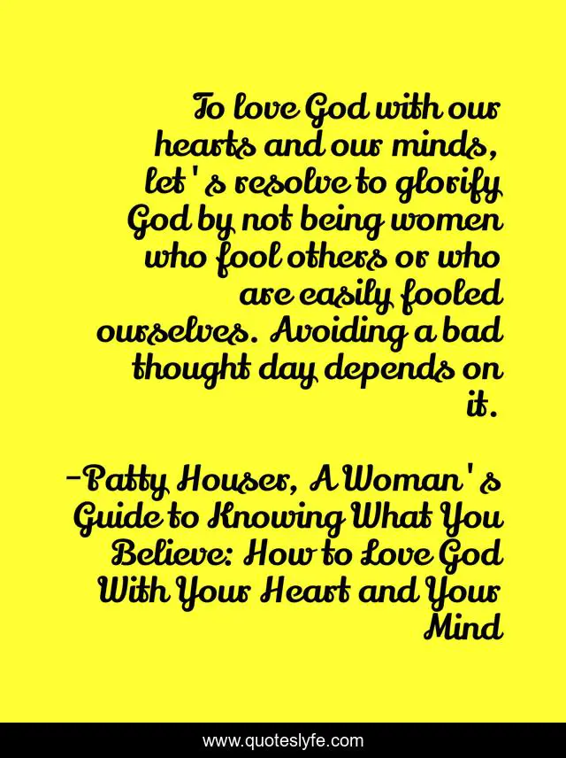 This page presents the quote "To love God with our hearts and our minds, let's resolve to glorify God by not being women who fool others or who are easily fooled ourselves. Avoiding a bad thought day depends on it.". Author of this quote is Patty Houser, A Woman's Guide to Knowing What You Believe: How to Love God With Your Heart and Your Mind. This quote is about faith, glorifying-god, god, loving-god, beliefs, thoughts,.