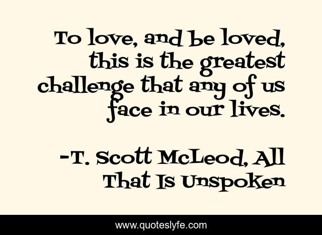 This page presents the quote "To love, and be loved, this is the greatest challenge that any of us face in our lives.". Author of this quote is T. Scott McLeod, All That Is Unspoken. This quote is about lovers-quarrel, love, relationship, acceptance, acceptance-of-others, self-acceptance, affection,.