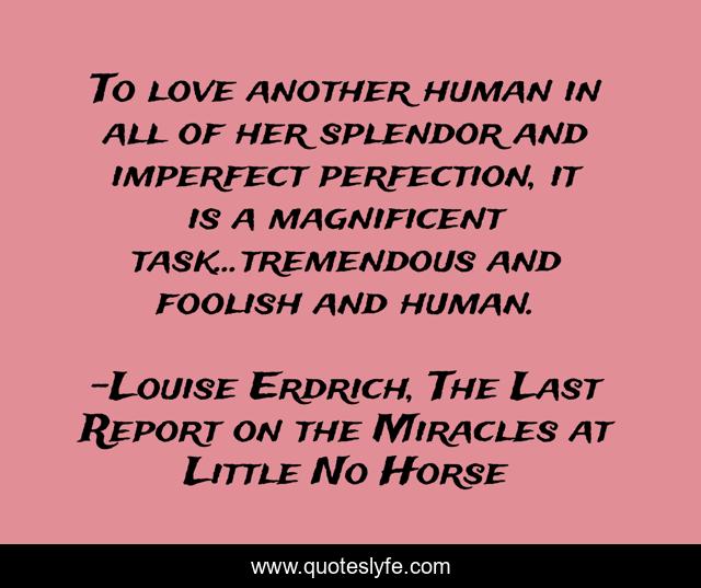 This page presents the quote "To love another human in all of her splendor and imperfect perfection, it is a magnificent task...tremendous and foolish and human.". Author of this quote is Louise Erdrich, The Last Report on the Miracles at Little No Horse. This quote is about love, humanity, affection, imperfection,.