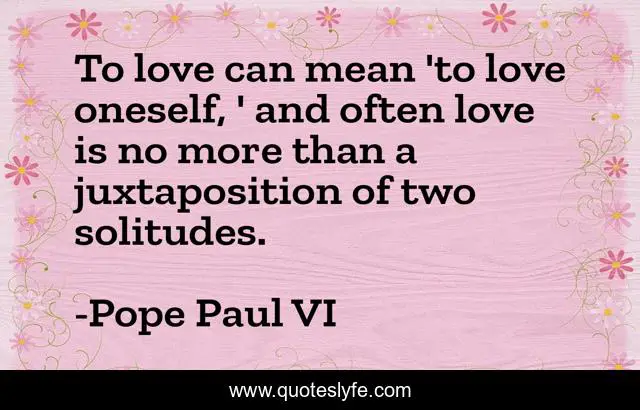 This page presents the quote "To love can mean 'to love oneself, ' and often love is no more than a juxtaposition of two solitudes.". Author of this quote is Pope Paul VI. This quote is about selfishness, solitude, love, affection,.