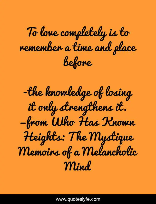 "the knowledge of losing it only strengthens it. —from Who Has Known Heights: The Mystique Memoirs of a Melancholic Mind Quotes." Quoteslyfe.com, 2025. Mon. 08 Dec. 2025. <https://www.quoteslyfe.com/quote/To-love-completely-is-to-remember-a-251744>.