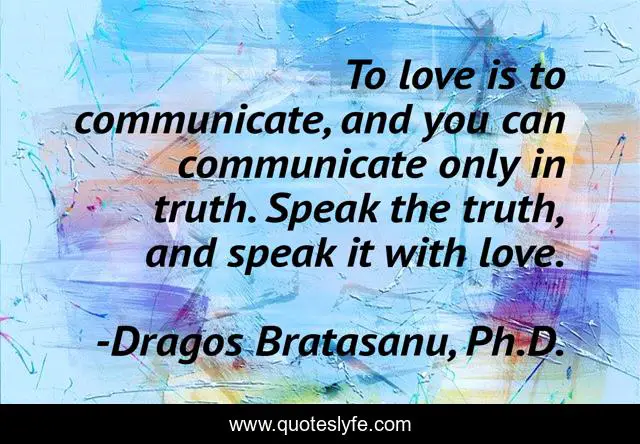 This page presents the quote "To love is to communicate, and you can communicate only in truth. Speak the truth, and speak it with love.". Author of this quote is Dragos Bratasanu, Ph.D.. This quote is about relationships, life, love, truth, communication, wisdom, inspirational, enthusiasm, affection,.
