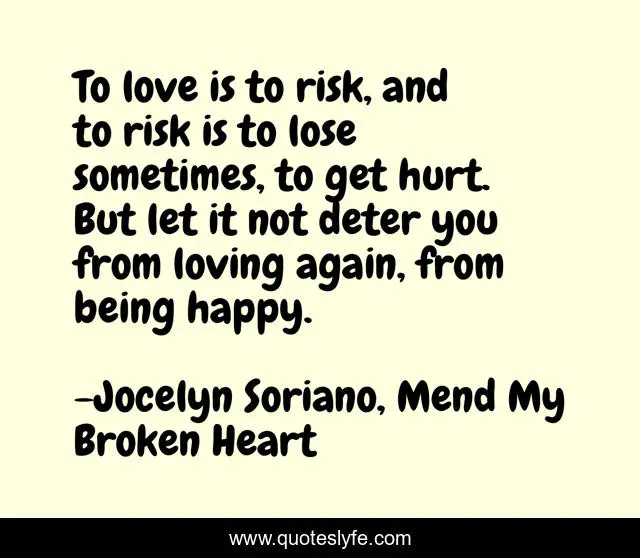 This page presents the quote "To love is to risk, and to risk is to lose sometimes, to get hurt. But let it not deter you from loving again, from being happy.". Author of this quote is Jocelyn Soriano, Mend My Broken Heart. This quote is about broken-heart, love, breakup, hurt-feelings, heartbreak, healing, broken-hearted, heartbroken, affection,.