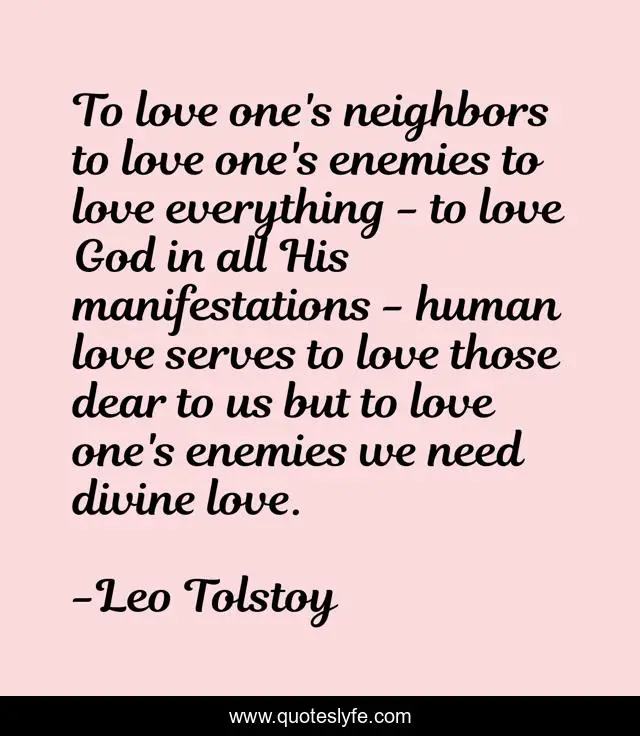 This page presents the quote "To love one's neighbors to love one's enemies to love everything - to love God in all His manifestations - human love serves to love those dear to us but to love one's enemies we need divine love.". Author of this quote is Leo Tolstoy. .