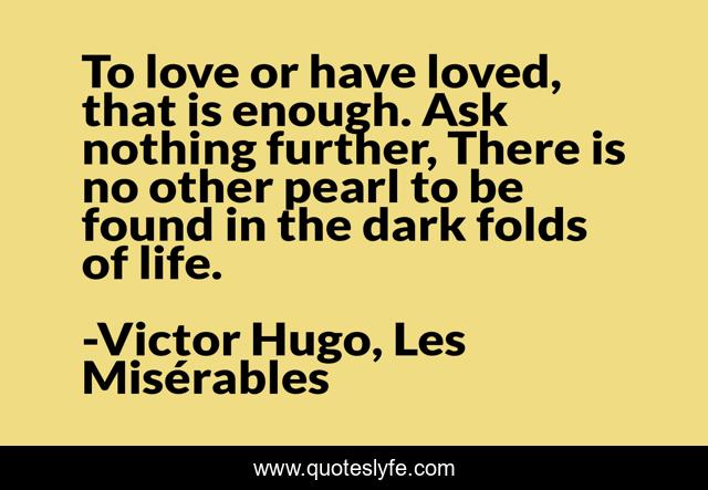 This page presents the quote "To love or have loved, that is enough. Ask nothing further, There is no other pearl to be found in the dark folds of life.". Author of this quote is Victor Hugo, Les Misérables. .