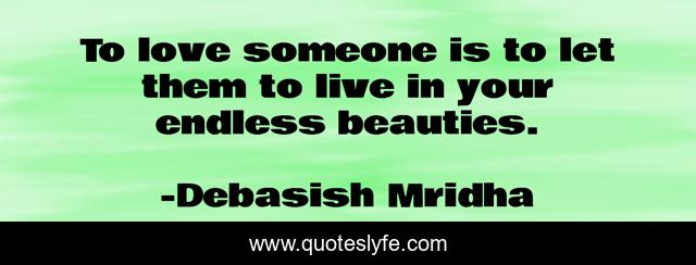 This page presents the quote "To love someone is to let them to live in your endless beauties.". Author of this quote is Debasish Mridha. This quote is about debasish, love, mridha, philosophy, debasish-mridha, endless-beauties, to-love-someone, affection,.