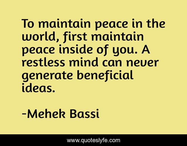 This page presents the quote "To maintain peace in the world, first maintain peace inside of you. A restless mind can never generate beneficial ideas.". Author of this quote is Mehek Bassi. This quote is about love, peace, mind, idea, rest, world, affection,.