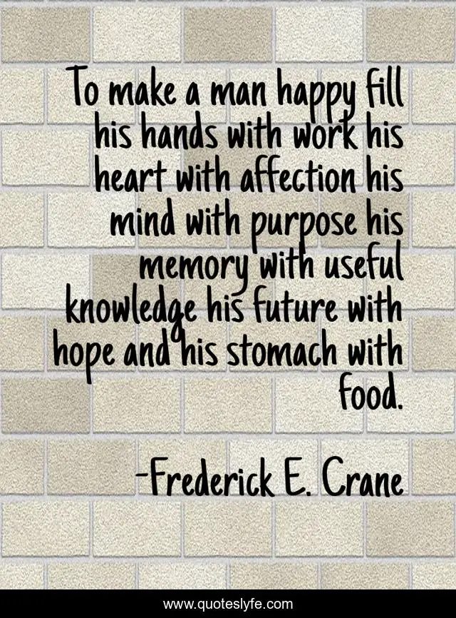 This page presents the quote "To make a man happy fill his hands with work his heart with affection his mind with purpose his memory with useful knowledge his future with hope and his stomach with food.". Author of this quote is Frederick E. Crane. .