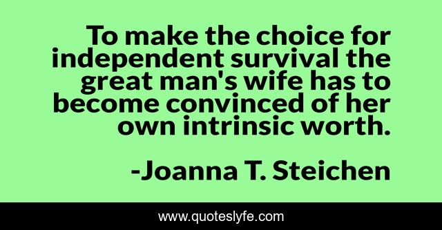 This page presents the quote "To make the choice for independent survival the great man's wife has to become convinced of her own intrinsic worth.". Author of this quote is Joanna T. Steichen. This quote is about self, acceptance,.