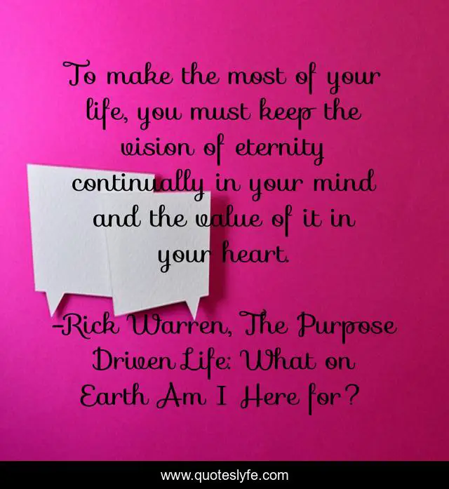 This page presents the quote "To make the most of your life, you must keep the vision of eternity continually in your mind and the value of it in your heart.". Author of this quote is Rick Warren, The Purpose Driven Life: What on Earth Am I Here for?. This quote is about eternity, life, fulfillment,.