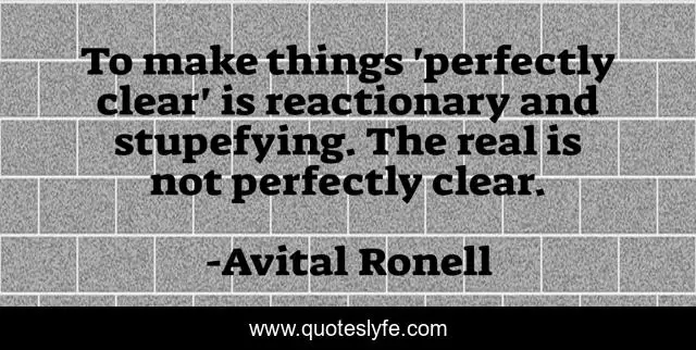 This page presents the quote "To make things 'perfectly clear' is reactionary and stupefying. The real is not perfectly clear.". Author of this quote is Avital Ronell. .