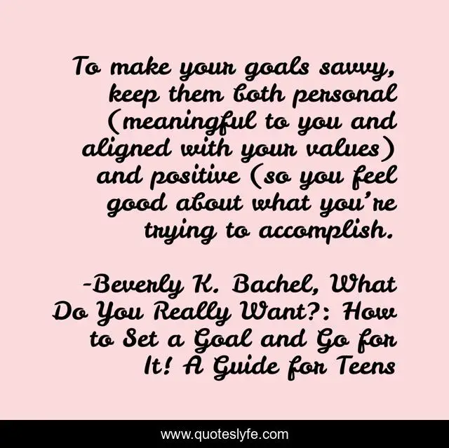 This page presents the quote "To make your goals savvy, keep them both personal (meaningful to you and aligned with your values) and positive (so you feel good about what you’re trying to accomplish.". Author of this quote is Beverly K. Bachel, What Do You Really Want?: How to Set a Goal and Go for It! A Guide for Teens. This quote is about teen, parenting, parenting-teens, nonfiction, inspirational, enthusiasm, nonfiction-self-help, young-adult,.