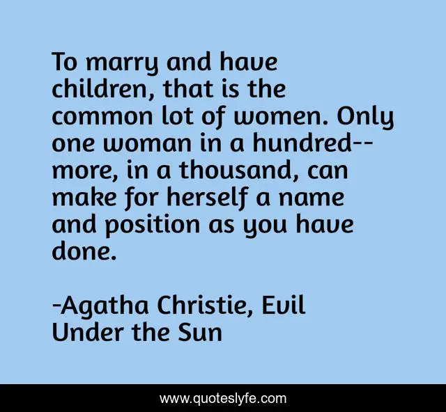 This page presents the quote "To marry and have children, that is the common lot of women. Only one woman in a hundred--more, in a thousand, can make for herself a name and position as you have done.". Author of this quote is Agatha Christie, Evil Under the Sun. This quote is about woman, strength, uncommon,.