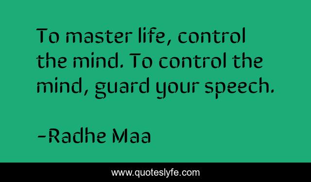 This page presents the quote "To master life, control the mind. To control the mind, guard your speech.". Author of this quote is Radhe Maa. This quote is about spiritual, radhe-guru-maa, spiritual-leader, radhe-maa, spiritual-sayings, wisdom, quotes-and-saying, inner-peace, spiritual-insights,.